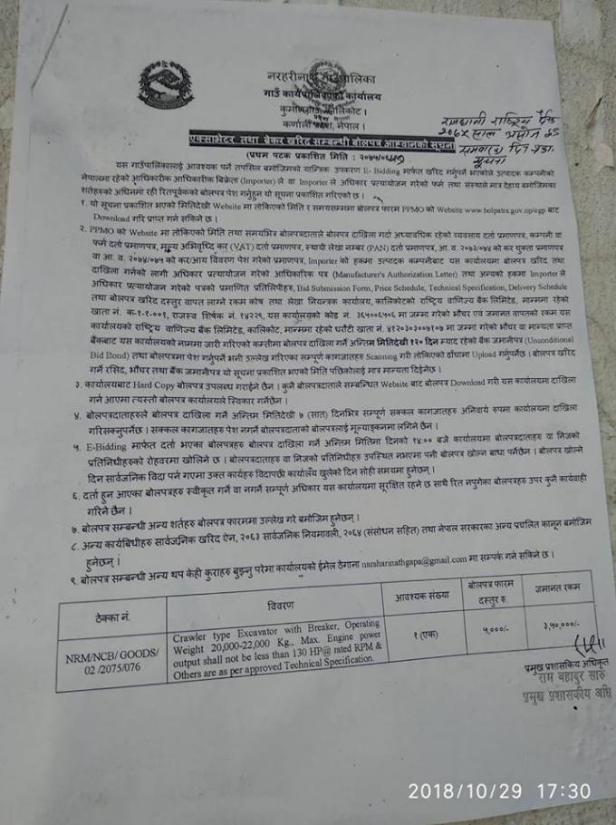 » एक्साभेटर तथा ब्रेकर खरिद सम्बन्धी बोलपत्र अाह्वानको सूचना ।